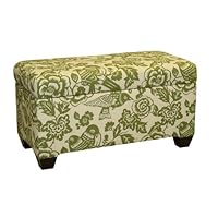 This bench is at the foot of our bed. It doubles as a laundry hamper. It is exactly what I was hoping for.The colour is between a moss and a sage. It isn't as yellow green as I thought the pictures portrayed. I am glad for that. The quality of bench and fabric is pretty good. I rated it a four because the fabric doesn't match up on the lid and base. Fortunately, mine isn't too noticeable that I'd want to send it back as did a previous reviewer. But, I lucked out because I can see how it could look really bad if my fabric happened to placed be 2 inches over on the lid. The placement of the birds would make them two headed and it would be weird. So it depends on which one you get if it will look good. The manufacturer could easily eliminate this issue by better aligning the fabric. It doesn't have to be a perfect match, but at least a match that flows. Mine is close enough.