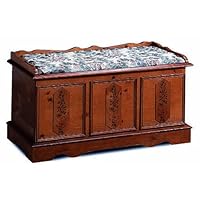 Okay, for the price we all know it is not a REAL Cedar Wood Chest (although I was hoping it was). It is pressed wood with a thin layer of Cedar. The outside is veneer on pressed wood. The top of the chest didn't have pre-drilled holes for the hardware that goes with the "locking" mechanism. My husband made a template and we screwed the top locking mechanism on. The lock doesn't work. It's junky and be careful you don't close the lid and have it lock and you can't unlock it! That would be the end of using it for storage. :-) That didn't happen to us but it was in my thoughts. So, we are not messing with the "lock" thingy it offers. The painted floral accents are junky and I might stick something on top of the raised wood section that has the floral accents. Overall you and I know we can't buy a real quality item at this price. I'm keeping the chest because of the cost to return it and being that we glued the pegs in I don't think we could return it anyway. Hey, it was the width we needed, that's something I can say positive. So, you might want to think of looking for a different wood chest or not.The product took many weeks before it was shipped. When it finally arrived it was damaged, the front foundation panel was cracked. The chest is made from poor quality materials so I wouldn't necessarily blame the damage on rough handling during shipping. I had ordered this as a birthday present for my daughter. When I reported the damage, I was offered a tweny five dollars gift certificate (which I have never received). I believe the product should have been replaced at no charge to me or a complete refund offered.Buy Coaster Cedar Wood Chest, Pine Finish with Hand Painted Floral Accents and Cushioned Pad Now