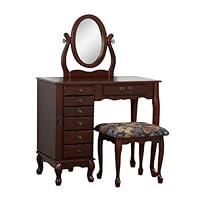 This vanity was exactly as advertised, it was delivered in good time and was completely secured in it's packaging. It was simple to put together, my two daughters and myself did this in an evening while watching TV. The wood is a cherry wood finish and nicely compliments other cherry wood pieces in my bedroom. I would certainly recommend this product and its seller and manufacturer to anyone I knew that was looking for a high quality vanity.I opened the package and pulled the top part of the vanity out and there was a big dent/nick on the drawer and the drawer handle was broken. This was a packaging issue. I am so disappointed and got everything ready for the new vanity and had to put my old vanity back. I can't order a replacement because they said they do not have anymore. I am very upset and may never order from amazon or at least this company again.Buy Powell Heirloom Cherry Jewelry Armoire Vanity Now