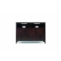 This arrived by truck well padded and boxed. It survived its trip with only two tiny nicks on the bottom. It's solidly made, already assembled, and has real honest to goodness wood in it. I really like this piece, the style is great and the espresso color is absolutely has shown in the pic.