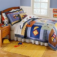 Very thick quilt, perfect for my toddler's room. Flannel like feel on the back. Just as cute in person as it is on the website. Nice large size for my son's twin bed. Hope he will sleep in his big boy bed now that it will have trucks on it!I was so excited to get this quilt for my son's room until it showed up. The material that looks light blue is actually more of an 1980's acid wash jean material. The plaid is a weird turquoise color. In real life, this was not very cute. It was just ugly. Very disappointing. It is being returned.Buy Pem America Construction Quilt Set Now