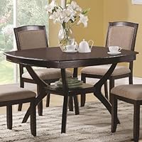 I love the design of this table. It's really pretty, and the color is quite nice. We ordered some cappuccino finish chairs that are also made by Coaster (Side Chair with Cross Back Design), and the table is just a tad bit lighter than the chairs and has a very, very slightly more red tone than the chairs do. They match pretty well though; the difference is really minor. The table is really sturdy and was easy to put together. The table legs have levelers in the bottoms so that you can stabilize it on an uneven floor if needed, which is nice. My only complaint would be that the table has a few nicks in the finish, mostly very minor, which clearly had to have been there before it was shipped (it was packaged really well and therefore shouldn't have happened during the shipping process). I really mean minor. They're small spots without finish, just a few mm in diameter, not big scratches or gouges. None of them were enough for us to send it back. The top of the table is pretty clear of nicks. Most of them are on the legs, and one is on a side of the shelf. A few dabs of a wood finish marker and they're blended well-enough. We turned the one spot that was slightly worse than the others--the one on the shelf--toward the wall, too, just in case. If you want a perfectly unblemished table, you probably shouldn't be ordering one online anyway. If a few minor blemishes aren't going to bother you, it's a really great table.This is a great table. It is heavy and sturdy. No one will ever believe that I put it together myself. The assemble was very easy. It looks great with the chairs I picked up at Target.The delivery man had to leave it outside the door because I was not here when he delivered it. I struggled to get it into the door. It is that heavy. I did manage to get it assembled and flip it over by myself. (I am 5'1" and 138 lbs female.)